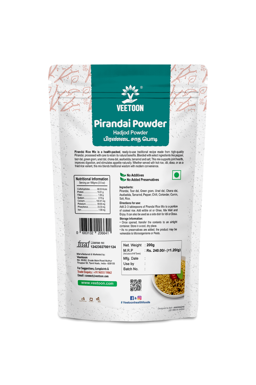 Pirandai Rice Mix is formulated to save your kitchen time. It is a combination of pirandai, spices, various dal and other ingredients to make you feel good with awesome taste and flavour. No additives or preservatives added. Best suitable for all ages. NABL lab tested for purity and quality.
